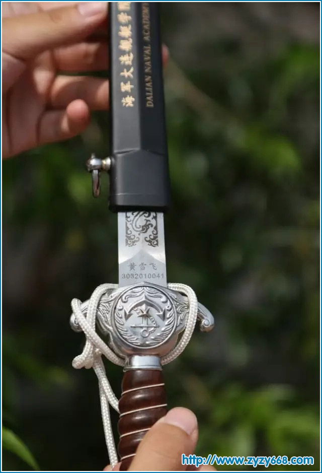| 佩剑专门设计定制而成,剑格上刻有海军锚与浪花,凸显海军特色。这是一把钛钢佩剑,剑柄为红木金属丝缠绕装饰,锋刃上镌刻着学员名字和学号。 |